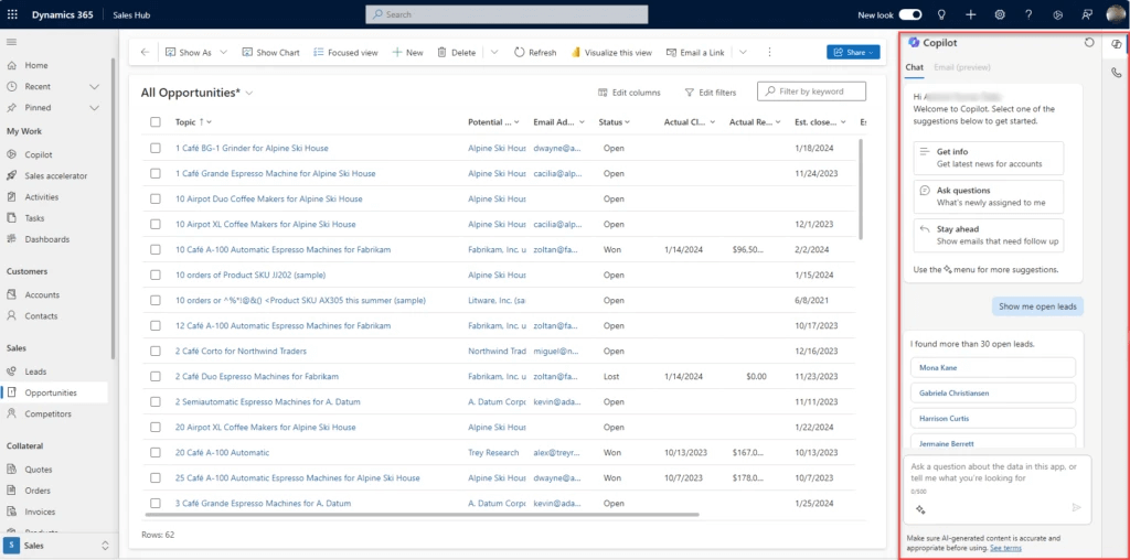 Satış ekipleri genellikle çok sayıda potansiyel müşteri ve hesap yönetir. Zamanla bu iş yükü birikebilir ve satış temsilcilerinin müşterileriyle kişiselleştirilmiş bir deneyim sunmasını zorlaştırabilir. Dynamics 365 Sales’teki Copilot, özetler sağlama ve e-posta içerik fikirleri oluşturma gibi çeşitli araçlarla verimliliği artırarak bu dengeyi korumaya yardımcı olur.