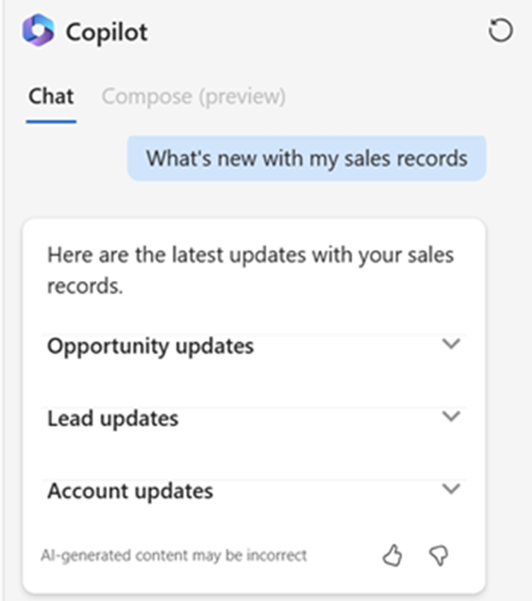 Herkes birkaç gün izin aldıktan sonra gelen kutusuna döndüğünde tüm e-postaları ve güncellemeleri yakalamaya çalışırken zorlanabilir. Copilot, atanmış kayıtlarınıza yapılan en son güncellemeleri toplayarak bu stresi hafifletmeye yardımcı olur. Kayıt özetlerinde olduğu gibi, bu özetlere dahil edilen alanlar da bir yönetici tarafından ayarlanabilir. Bu Copilot özelliğinden yararlanmak için, yöneticinizin ilgili kayıt türü için denetim özelliğini etkinleştirdiğinden emin olmanız gerekir.