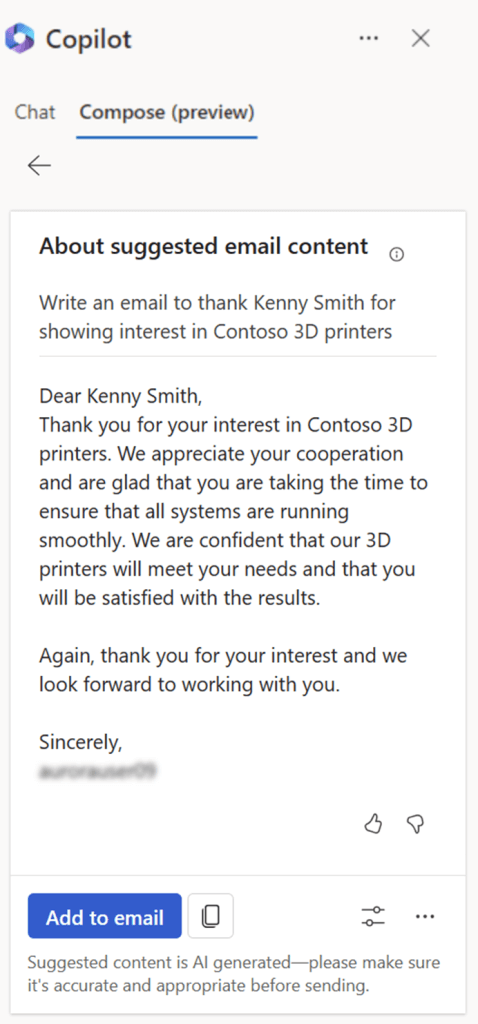 Günümüz yapay zeka teknolojisinin en çok bilinen özelliklerinden biri, metin oluşturma yeteneğidir. Microsoft, Copilot’a bu özelliği dahil ederek potansiyel müşteriler ve fırsatlar için e-posta içeriklerini oluşturma ve önceki e-posta konuşmalarınızı özetleme yeteneği kazandırmıştır. Bu özellik, önemli noktaları içeren bir e-posta taslağı oluşturmanın harika bir yoludur. Ancak, tüm yapay zeka içeriklerinde olduğu gibi, oluşturulan metni gözden geçirip, kişisel tarzınıza daha uygun hale getirmek isteyebilirsiniz. Yapay zeka bazen fazla “robotik” görünebilir.